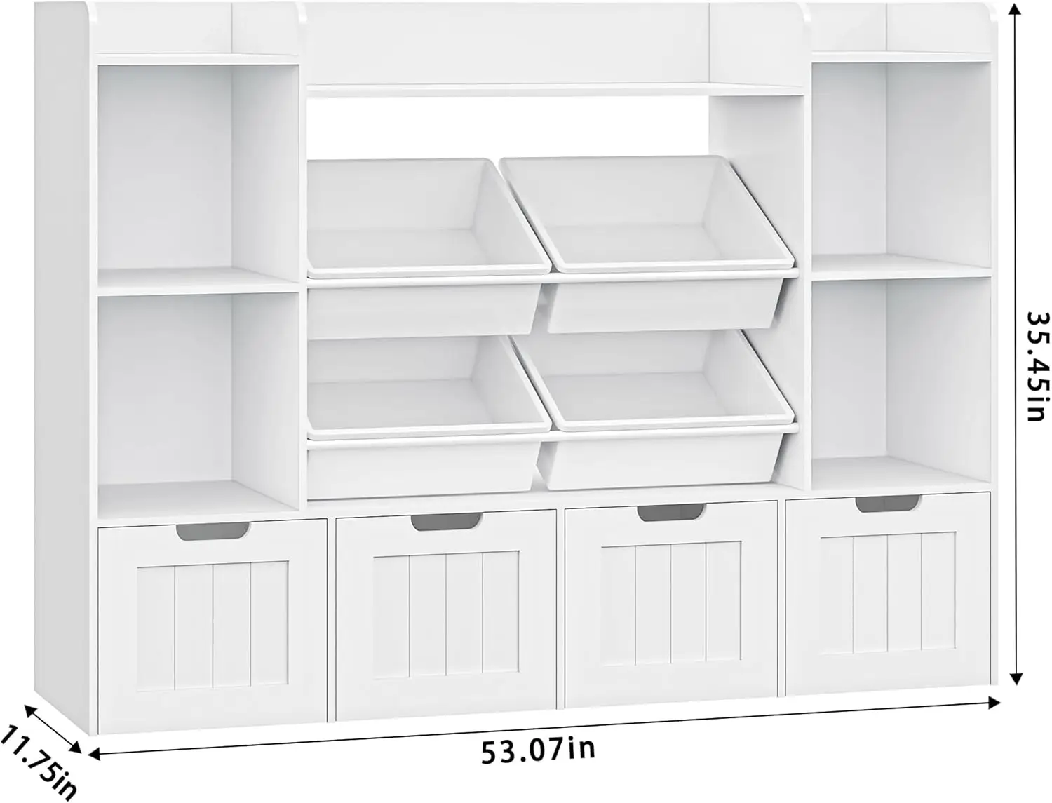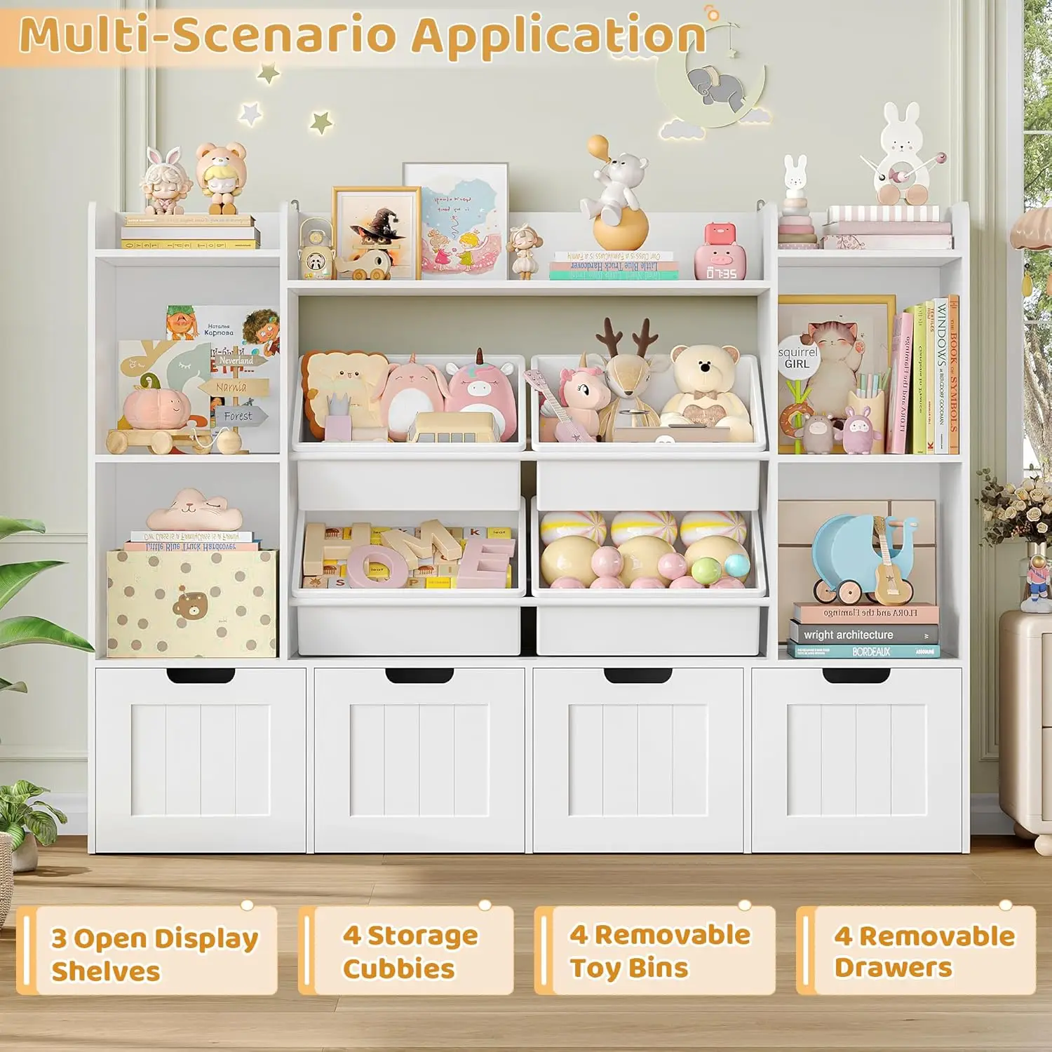 - 【4-in-1 Multifunctional Toy Storage Organizer】Say goodbye to messy floors and scattered toys! This all-in-one toy organizer is designed to keep your little one’s space neat and accessible. With 3 open shelves, 4 large box bins, 4 storage cubbies, and 4 smooth-rolling drawers (with hidden 360° wheels), there’s a perfect place for every toy, book, puzzle, and art supply. The open design helps kids easily find and grab what they need—no more digging through mystery bins!